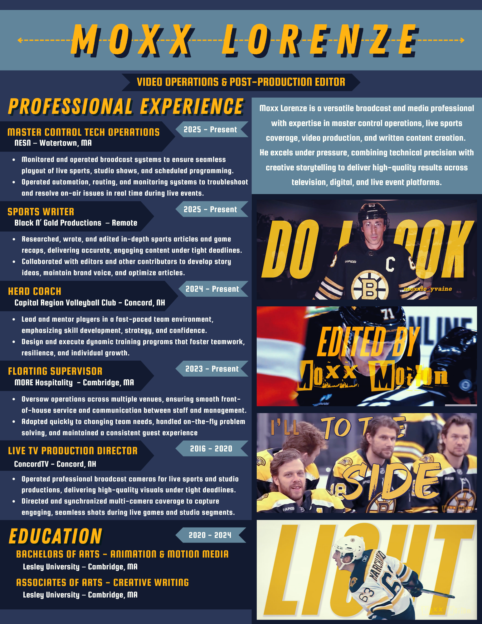 Moxx Lorenze is a Boston-Based broadcast and media Professional with experience in live sports production, master control operations, and creative storytelling.